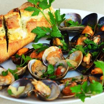 vongole, midii și baghetă cu cremă de unt. mediteranean