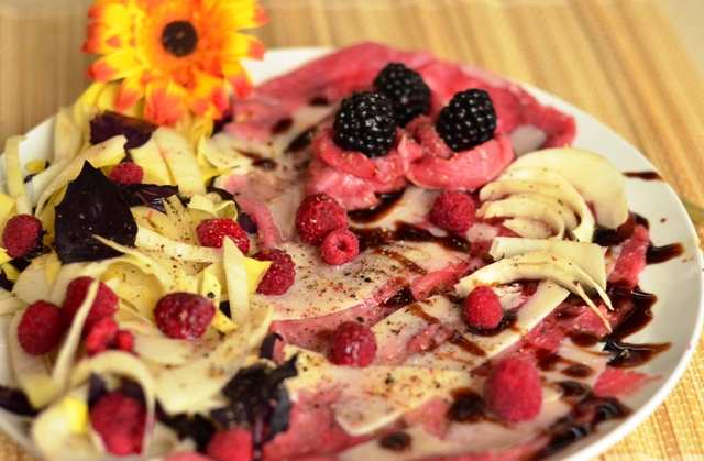 carpaccio de vițel, andive, zmeură și mure