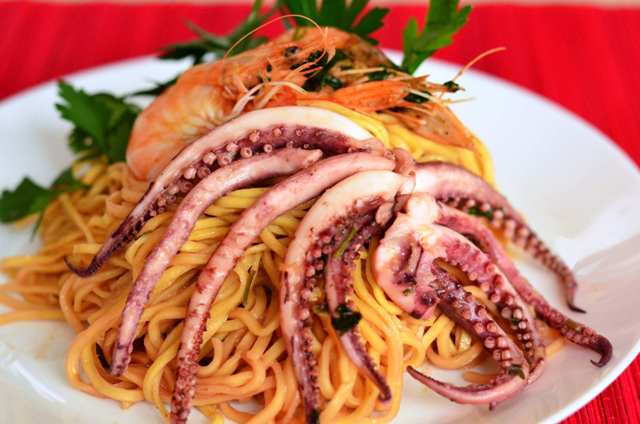 fresh spaghetti cu creveți și calamari. siciliene