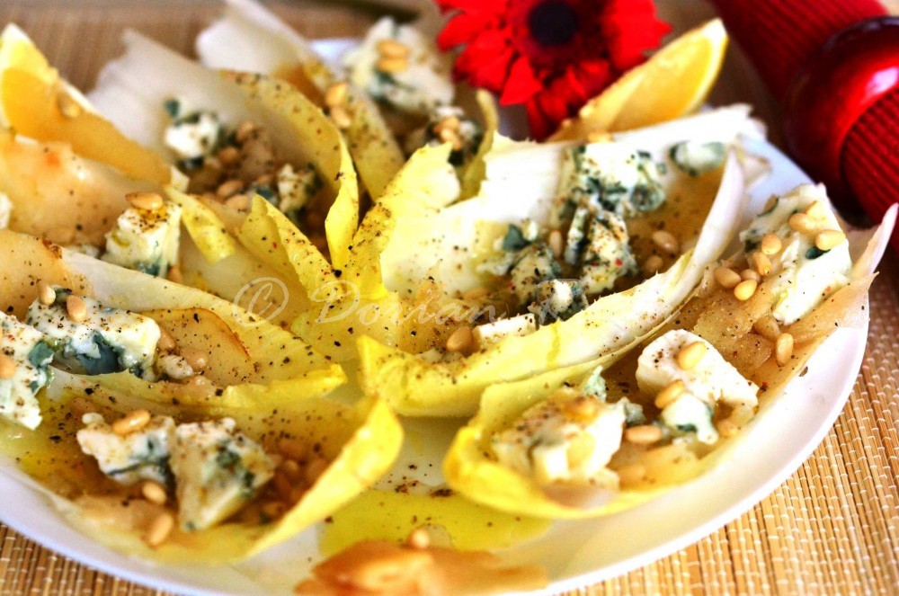 Vă propun o salată-starter, în care gustul ușor amărui al andivelor se echilibrează cu aroma perei și cu gustul ușor înțepător al brânzei Roquefort. Câteva semințe de pin sau miez de nucă, suc de lămâie și câteva picături de ulei aromat cu trufe sau ulei de nucă alcătuiesc o salată rafinată.