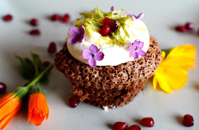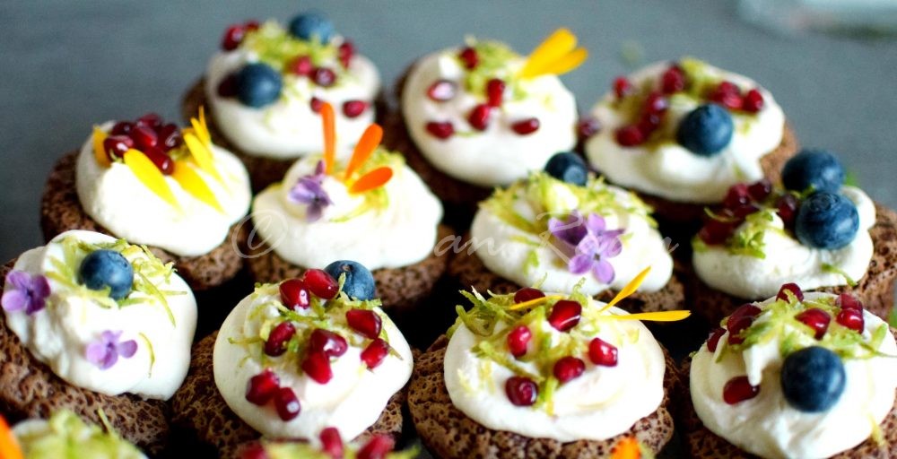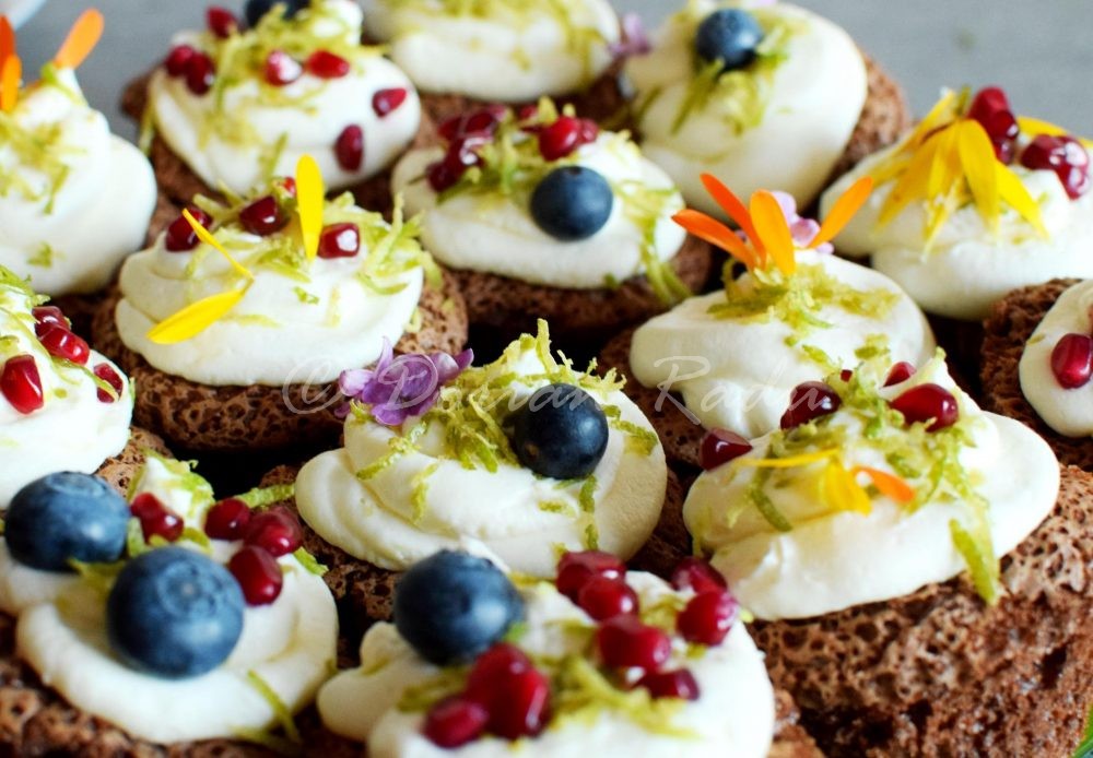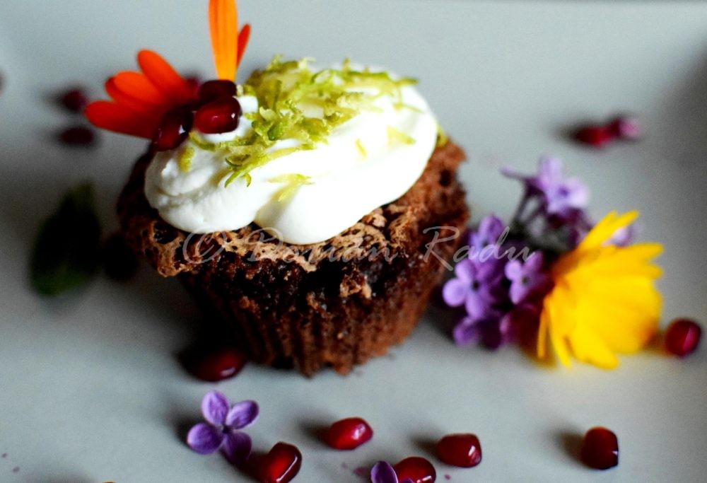 În weekend l-am sărbătorit pe prietenul nostru Dodo, s-a mai învechit cu un an, i-a mai crescut un pic valoarea 😛 . Desertul petrecerii a fost acest frumos grup de brioșe cu cremă de mascarpone, decorate de fete cu petale de gălbenele, flori de liliac – ambele comestibile, cu ocazia asta am aflat și eu – și cu sâmburi de rodie, afine și coajă de lime rasă fin, iată rețeta Oanei: