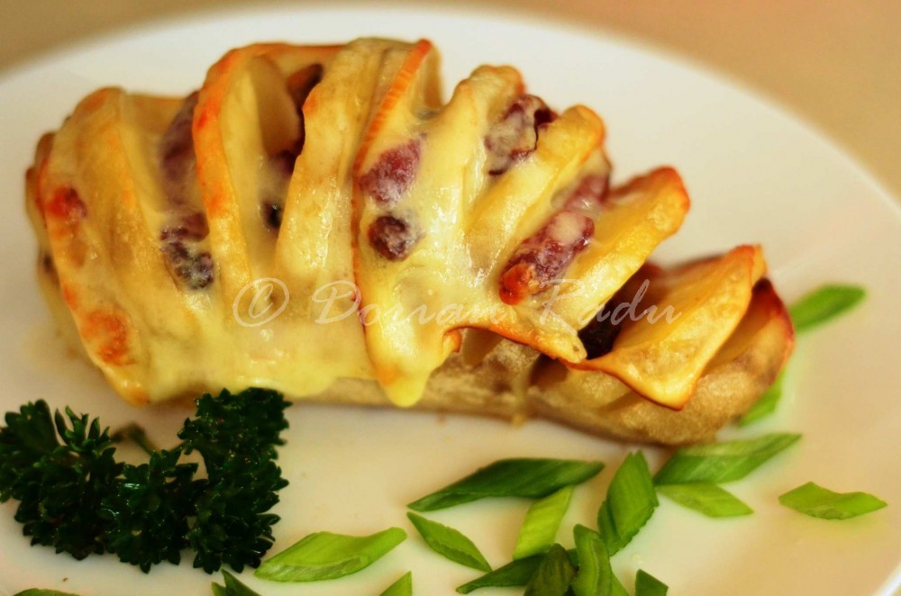 - cartoful evantai: l-am curatat de coaja, l-am taiat in felii verticale 3/4 din grosime, l-am impanat cu bacon, l-am uns cu unt, i-am dat un praf de sare si piper, l-am dat la copt (impreuna cu cartoful barcuta)