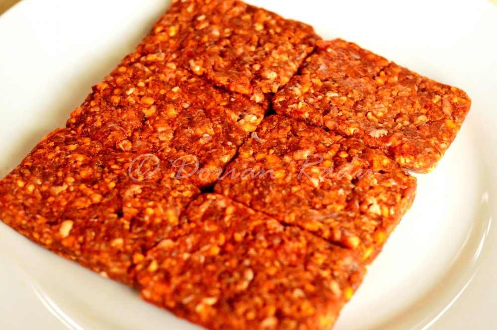 Ingredientele se amestecă până se obține o pastă omogenă, se împachetează în folie alimentară și se dă la rece pentru jumătate de oră, după care se frige după preferințe.