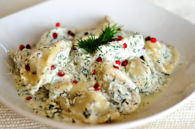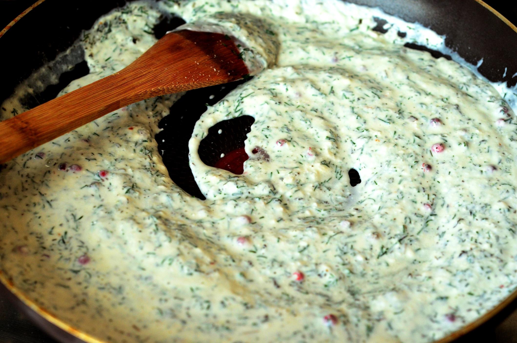 Prepararea este la fel de simplă ca și sosul în sine, într-o tigaie încălzită se pune iaurtul, se amestecă cu mirodeniile și se lasă pe foc mediu 3-4 minute, se adaugă mărarul tocat fin și apoi colțunașii fierți, se amestecă încă un minut și asta e, gustul întregii combinații este sublim. Textura catifelată a sosului se completează foarte bine cu un Chardonnay sau o Fetească Regală.