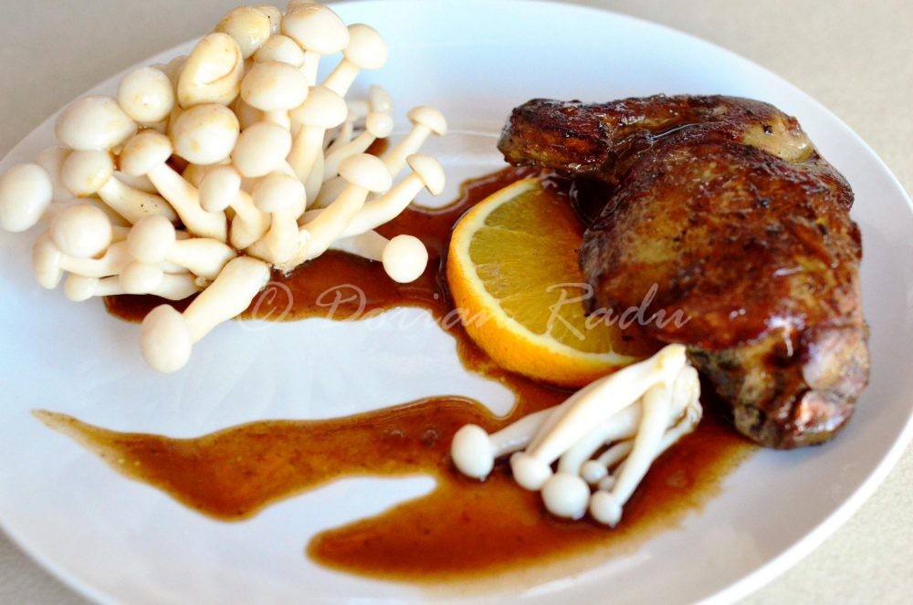 În untura rămasă după prăjeală (cam 2 linguri) am aruncat un shot de vinars de Jidvei. La un sos bun trebuie un alcool bun, nu ne jucăm. Am adăugat sucul a două portocale, 2 linguri de sos de soia și alte 2 linguri de cremă de oțet balsamic. La foc mediu am lăsat să se reducă sosul cam 5 minute. Un praf de piper, câteva felii de trufă neagră, am dat focul mic și am pus în sos o lingură de miere de salcâm (de salcâm s-a întâmplat să am în casa), am integrat mierea în sos, l-am mai lăsat pe cel mai mic foc 5 minute. Între timp am opărit și ciupercile.