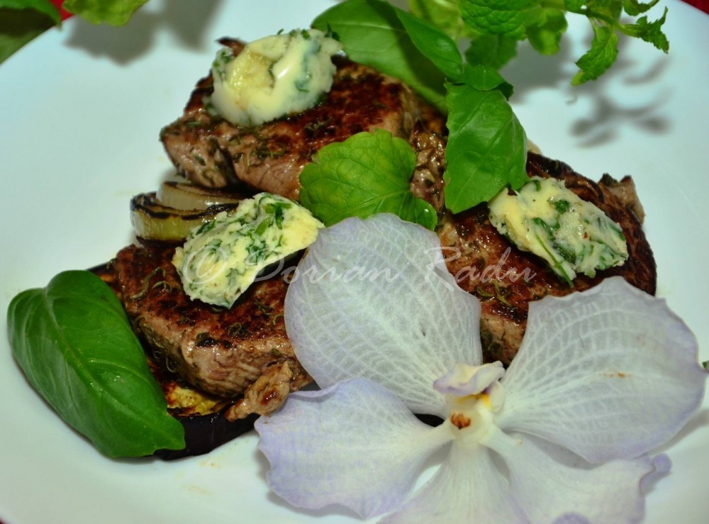 - 1 lingura de unt la temperatura camerei, amestecat cu patrunjel tocat, un praf de sare, piper si un catel de usturoi taiat felii si lasat apoi la rece