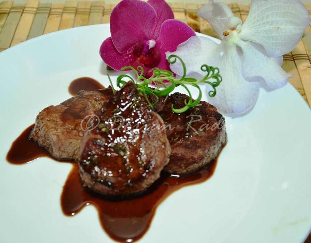 - daca veti folosi o tigaie clasica pe plita cu arzator normal, frigeti muschiul cate un minut pe fiecare parte, iar dupa ce turnati vinul si otetul balsamic, cate 2 minute pe fiecare parte – pentru un muschi in sange. Daca vreti mediu sau bine facut, mai prelungiti timpii cu circa 1 minut pentru mediu si doua pentru o patrundere ferma.