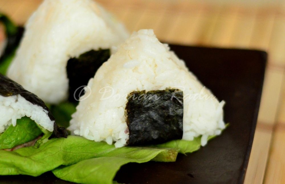 Pregătirea este o adevărată joacă în care copiii sunt bineveniți, pregătirea unor onigiri este un real team building. Orezul de sushi este foarte lipicios, de aceea în prealabil se pregătește un bol cu apă în care se pune o linguriță de sare. Se umezesc mâinile, se ia o porție de orez cât să încapă în palmă, se presează, se face un orificiu, se adaugă umplutura, se acoperă cu orez, se ornează cu o fășie de nori (foaie de alge pentru maki). Se tamponeză cu susan negru, sau seminte de chia, sau mac. Noi le-am umplut cu somon marinat în lămâie și avocado, tăiate în pătrățele mici. Eu le-am dat formă de triunghi, Claudia de semisferă. Yin-yang este în echilibru în cazul nostru.