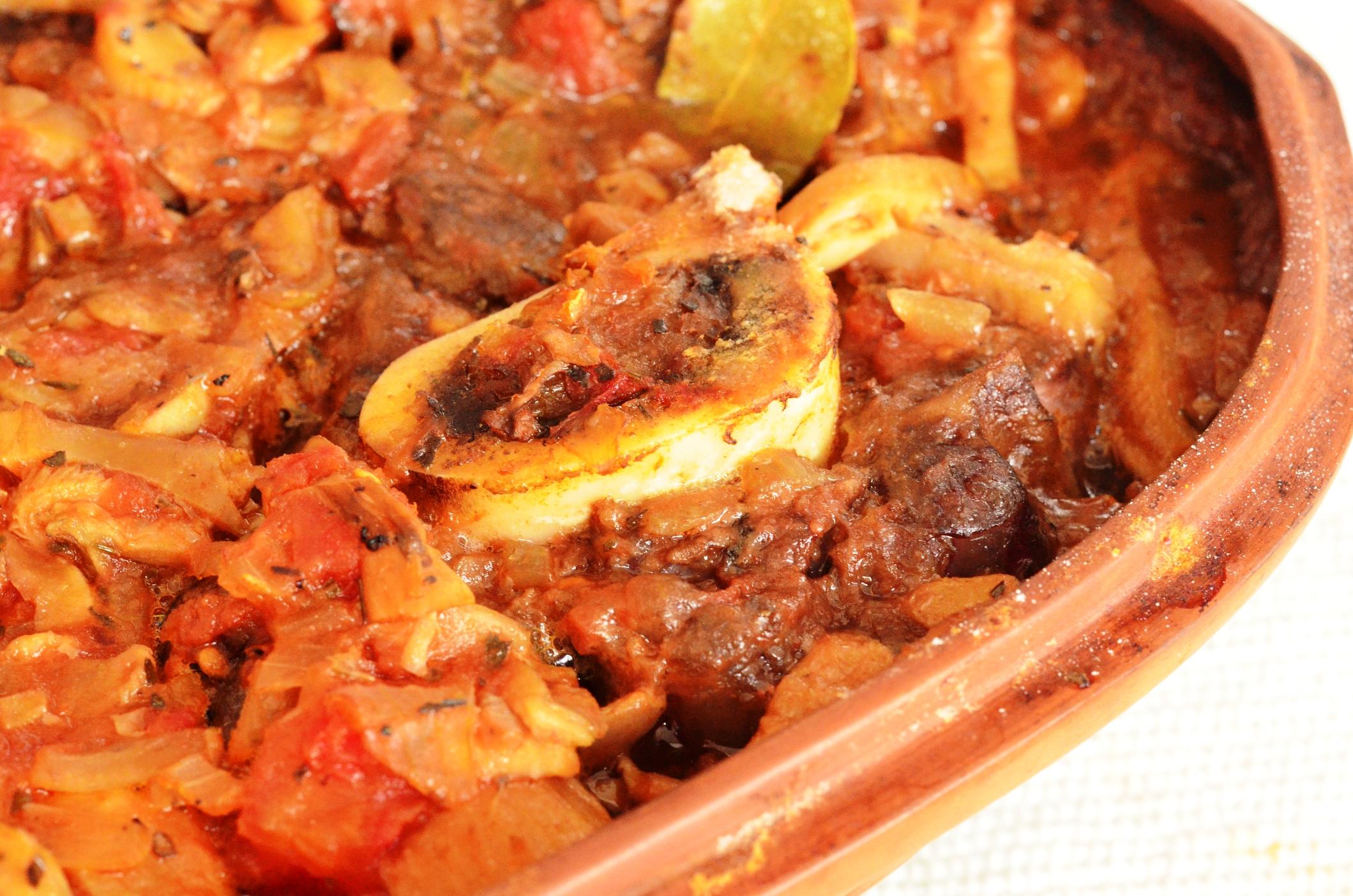 vasul roman, astfel încât sosul să depășească cu puțin mijlocul feliilor de rasol, l-am dat la cuptor (acoperit), am ridicat temperatura la 160ºC, l-am lăsat în pace vreo 3 ore jumate. Am adăugat roșiile, am amestecat și l-am mai lăsat la cuptor (descoperit) jumătate de oră.