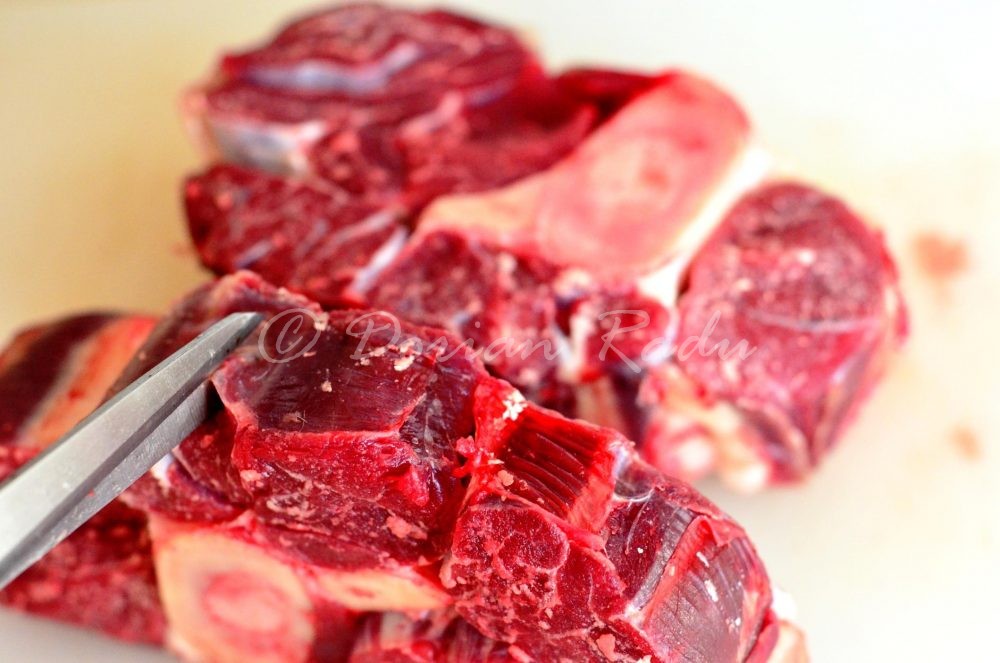Cu o oră înainte de gloriosul final, am preparat gremolata, să aibă timp se se combine gusturile: în mojar am frecat usturoiul cu sare, am adăugat, pătrunjelul și coaja de lămâie, am omogenizat si am amestecat cu 2 linguri de zeamă de lămâie. Am stropit mâncarea cu sos după ce am montat porțiile în farfurii. Nu uitați de măduvă, cu mămăligă sau pe pâine prăjită, frecată cu usturoi, cu un strop de sare, este sublimă.