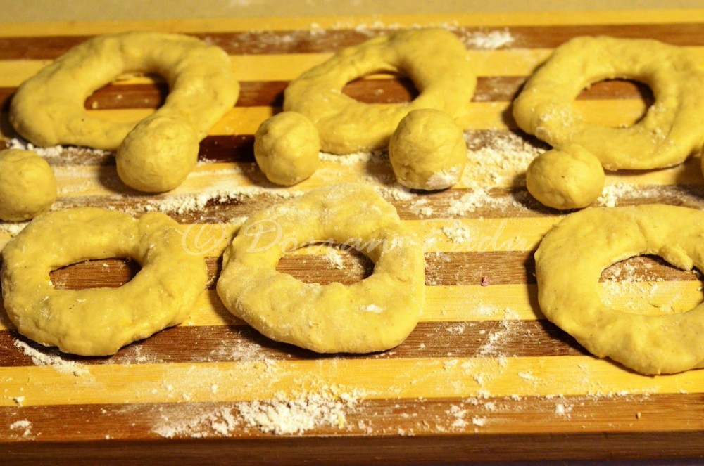 3. am împărțit aluatul în 8 bile cât o mandarină mică și alte 8 cat o nucă, le-am dat prin făină și le-am modelat în forma știută