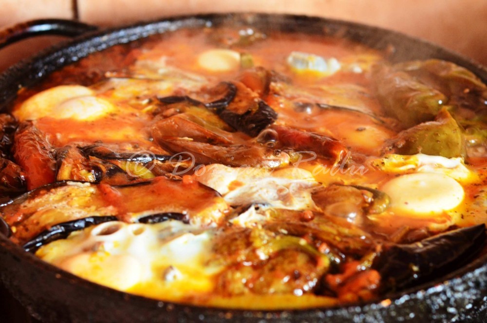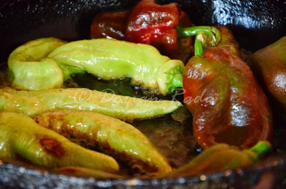 Ardeii ideali sunt cei capia verzi, dar se pretează toată familia ardeilor, inclusiv câțiva iuți dacă vă plac. Una din savorile acestei mâncări este dată de prăjirea ardeilor întregi, cu tot cu cotor, în ulei încins. Poate este mare tentația de a curăța cotoarele dar vă recomand sa nu vă atingeți de ele, stau foarte bine acolo unde sunt. Un alt ingredient tradițional este oul (ouăle) adaugat spre sfârșit sub formă de ochi. Practic este elementul care aduce proteina în mâncare. Este opțional, se poate și fără ouă, este la fel de gustoasă.