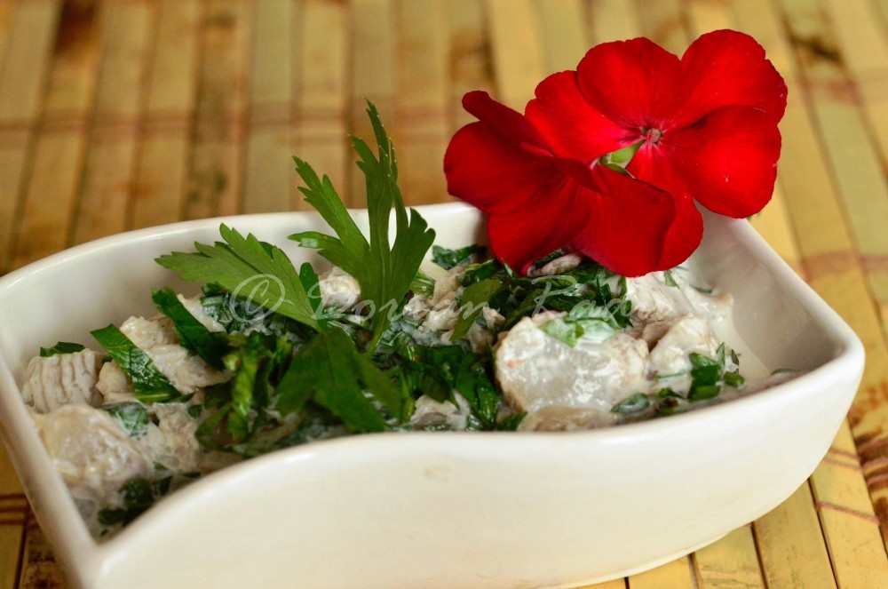 - usturoiul presat l-am frecat cu un praf de sare, l-am amestecat cu iaurtul, castraveții murați, pătrunjelul și uleiul de măsline