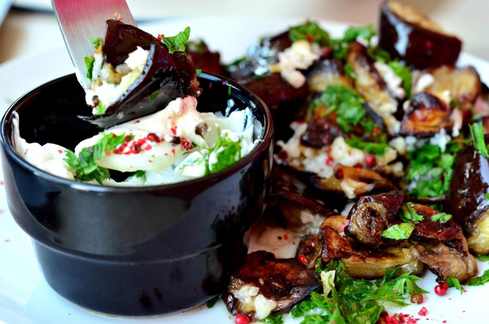 Vinetele – cu tot cu coajă – se taie în cuburi mari (3-4 cm latura), se aruncă peste ele un praf de sare semigrunjoasă, se amestecă bine astfel încât să fie toate bucățile atinse de sare, se pun într-o strecurătoare și se lasă la scurs cam jumătate de oră. La final se storc ușor, se stropesc cu ulei de măsline (cam 4 linguri la 1 kg de vinete) și se amestecă bine pentru ca toate bucățile să fie îmbrăcate de o peliculă de ulei, se pun într-o tavă pe un singur strat și se dau la cuptorul încins la 200ºC pentru 40-45 de minute. Se aranjează pe un platou, se lasă 10-15 minute, între timp se pregătește mujdeiul care se aruncă peste vinete. Iaurtul – gras și cremos – se amestecă cu o lingură de ulei de măsline, se presară totul cu pătrunjel verde, un praf de piper proaspăt măcinat (eu am folosit roz pentru aroma care se completează foarte bine cu vinete și iaurt) și asta e. A fost prima mâncare pe care am pregătit-o după vacanță cu gândul la cele frumoase plaje ale Greciei…