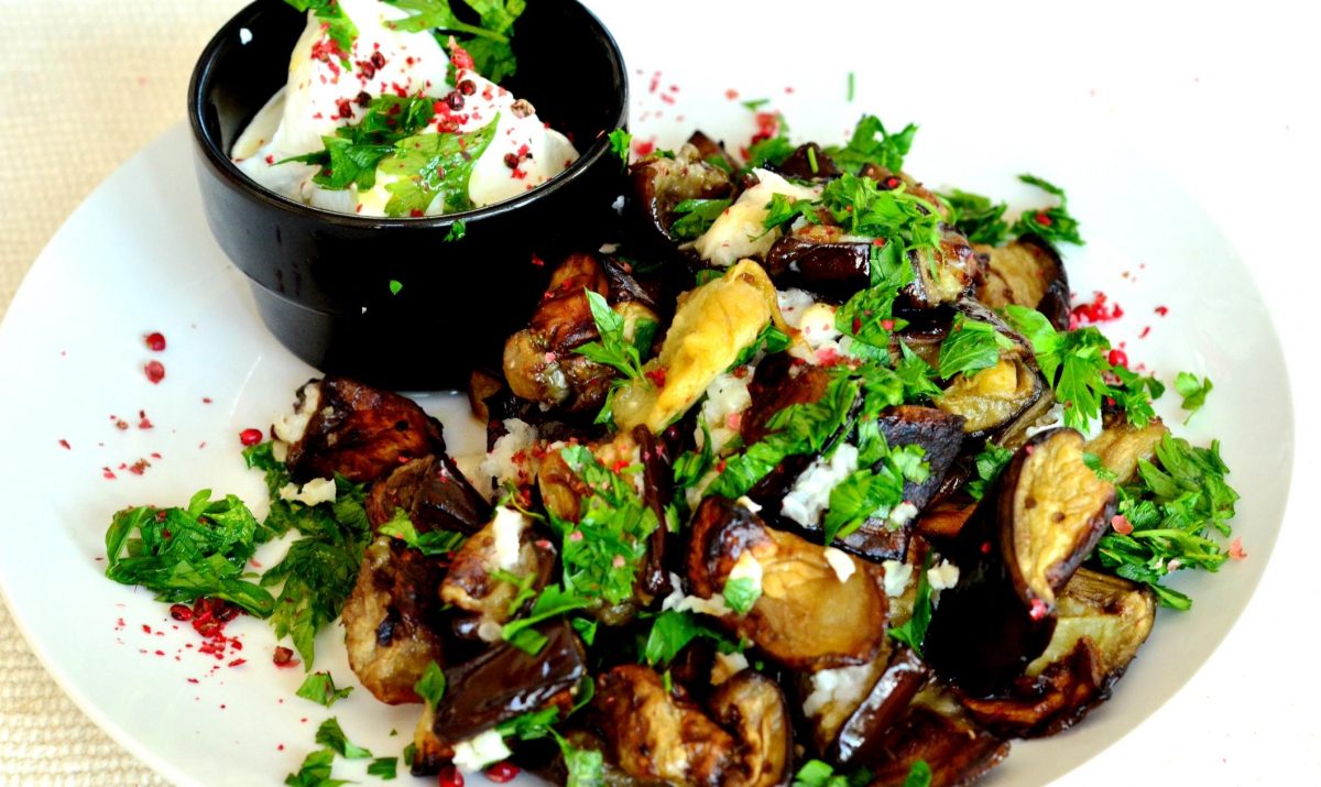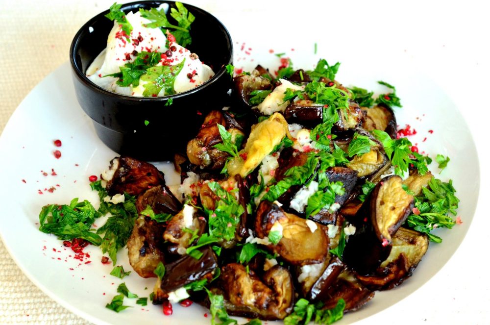 Într-una din serile petrecute în vacanță eram într-o tavernă, tocmai ce veniseră la masă aperitivele. Nu începusem bine să mâncăm când îl văd pe chelner defilând spre masa vecină cu un platou garnisit cu vinete și câte un bol cu mujdei de usturoi și altul cu iaurt gras. Mă întrebam cum de mi-a scăpat bunătatea, am luat din nou meniul la buchisit, scria ceva pe-acolo despre salată de vinete –Lefkada melitzanosalata – dar la școală am învățat că se referă la salata de vinete bătută, în nici un caz la bucăți de vinete coapte. N-am mai avut drum prin taverna cu pricina, dar în ultima zi am trecut pe la ei să le cer rețeta, ecuația este mai mult decît simplă, rezultatul este fenomenal.
