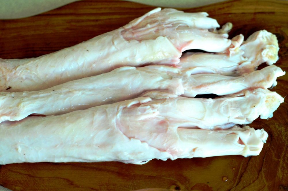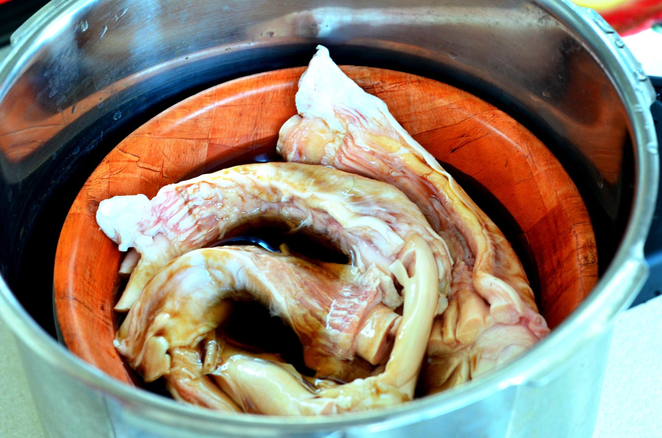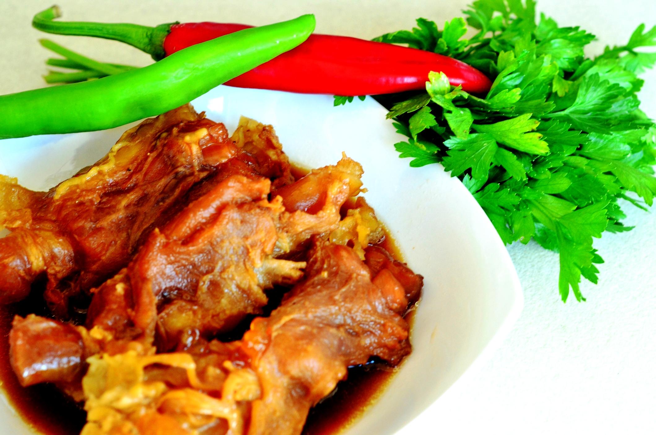 la jumătate și se pun la fiert în aburi. Sunt fierte în momentul în care se pot taia foarte ușor. Se lasă la răcit, se dau la frigider pentru jumătate de oră – cât să capete o textură fermă, apoi se feliază subțire, se amestecă cu sos (ingredientele mai jos), ceapă verde, pătrunjel și după dorințe cu usturoi zdrobit, ardei iute, castaveți proaspeți, semințe de susan. Salata se prepară cu cel puțin o oră înainte de a fi consumată (ideal 2 ore) pentru a da timp tendonului să se impregeneze cu aromele sosului și a verdețurilor. Parol d’honneur că trebuie încercată, nouă ne-a plăcut mult.