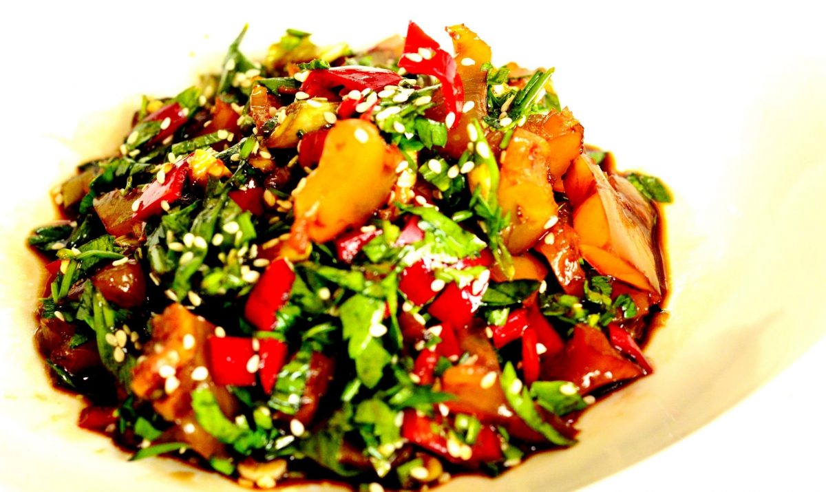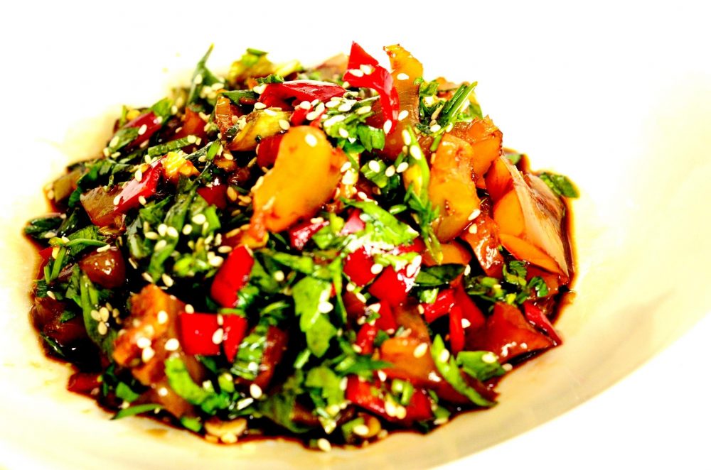 Pe mine m-a tentat salata, pe care am s-o descriu în rândurile ce urmează. Este o salată aromată, dulce-acrișoară, în care elementul principal este tendonul fraged, marinat în sos. Pentru reușita salatei este important procesul de fierbere al tendonului, care se face doar la steamer – fie de bambus, electric sau pe suportul de fiert la abur din oala sub presiune. În primele două cazuri se fierbe cca 4 ore; sub presiune sunt suficiente 2 ore -2 ore jumate. Tendoanele se spală bine cu apă rece, se pun într-un castron termorezistent peste care se toarnă un amestec de sos de soia light și apă în proporții egale, cât să acopere tendoanele până