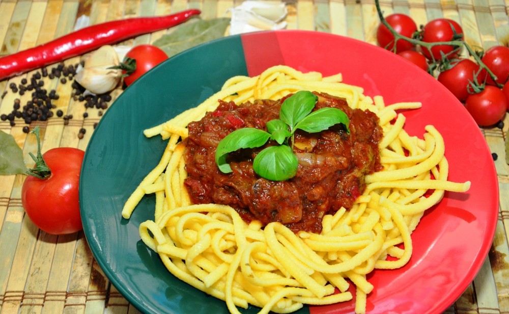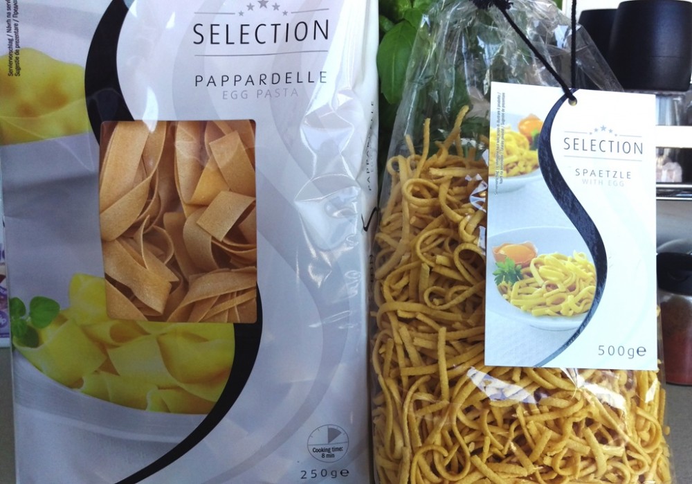 Am gasit recent pe raftul unui magazin niste paste premium: pappardelle si spaetzle. Papardeaua este o tagliatella mai lata, o sa ma ocup de ea zilele viitoare. Spaetzle sunt paste nemtesti pline de savoare, cu textura taiteilor grosi de casa, foarte apreciate in zona de sud a Germaniei – Bavaria, Baden-Württemberg – dar le intalnim si in Ungaria sub forma de csipetke sau la noi in forma galustilor de faina. Cele facute in casa sunt cele mai bune, dar merg la fel de bine in farfurie si cele gata preparate.