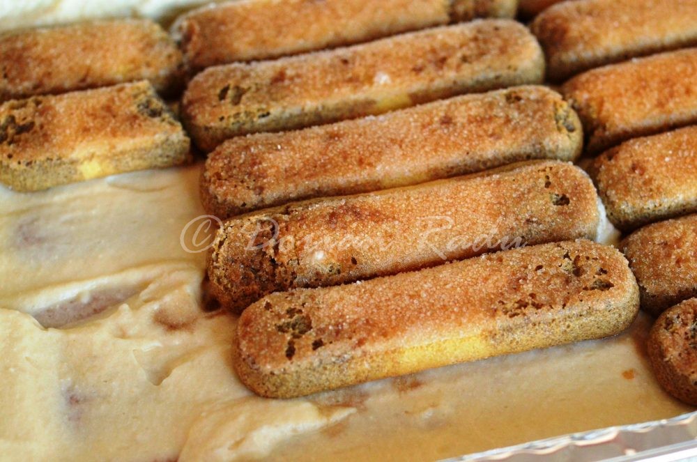 tiramisu-3Urmează montajul în tavă: pe fund se întinde un strat subțire de cremă, pișcoturile se trec unul câte unul scurt prin cafea – care poate fi aromată la rândul ei cu amaretto, brandy sau esență. Se montează primul strat de pișcoturi, se unge cu cremă, urmează al doilea strat, se întinde crema rămasă. Se dă la rece peste noapte, înainte de a fi consumat se pudrează cu un praf de cacao.
